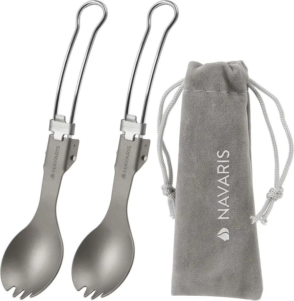 Titanium & stainless steel sporks/forks fold compactly with locking mechanisms – ultra-light for backpacking, camping, or travel, reusable and easy to clean with included carry bag.